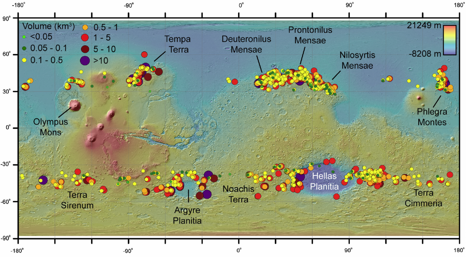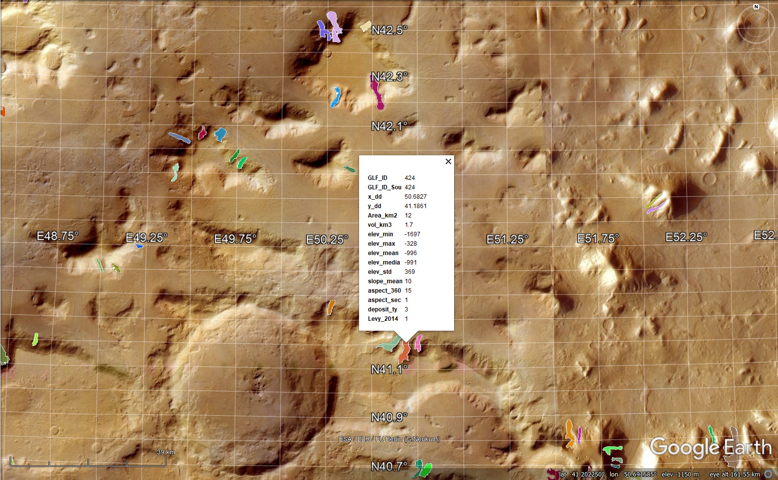 After obtaining a copy of the database associated with the aforementioned Brough, Hubbard, Hubbard, 2019 paper, we discovered that there were GIS Shapefiles included, complete with all sorts of juicy metadata. Using Google Earth Pro (free download), you can change from Earth to Mars. Then, drag and drop the shapefile into Google Earth Pro to get locations for mapped glaciers. You can click on a glacier to see what its details are, including estimates for volume of ice. Here’s a randomly selected glacier in Nilosirtus Mensae.