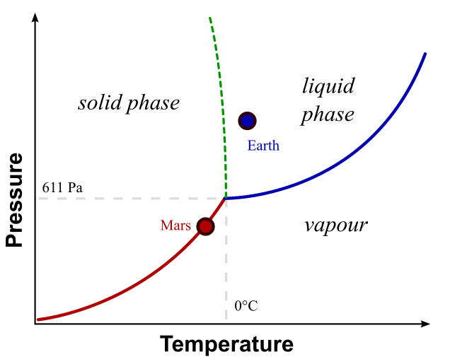 The most common form of water on Earth is in liquid form. But it can also exist as a gas (steam), or a solid (ice). The fact that water can exist as a liquid on Earth is rather remarkable. It is a side effect of our distance from the Sun keeping our temperature just right, and the fact that Earth has a nice thick atmosphere with lots of pressure, at least relative to Mars. The following graph was lifted from the wiki article on the triple point of water, but I’ve modified it to add Earth and Mars. This is a cartoon sketch - locations and values are approximate..