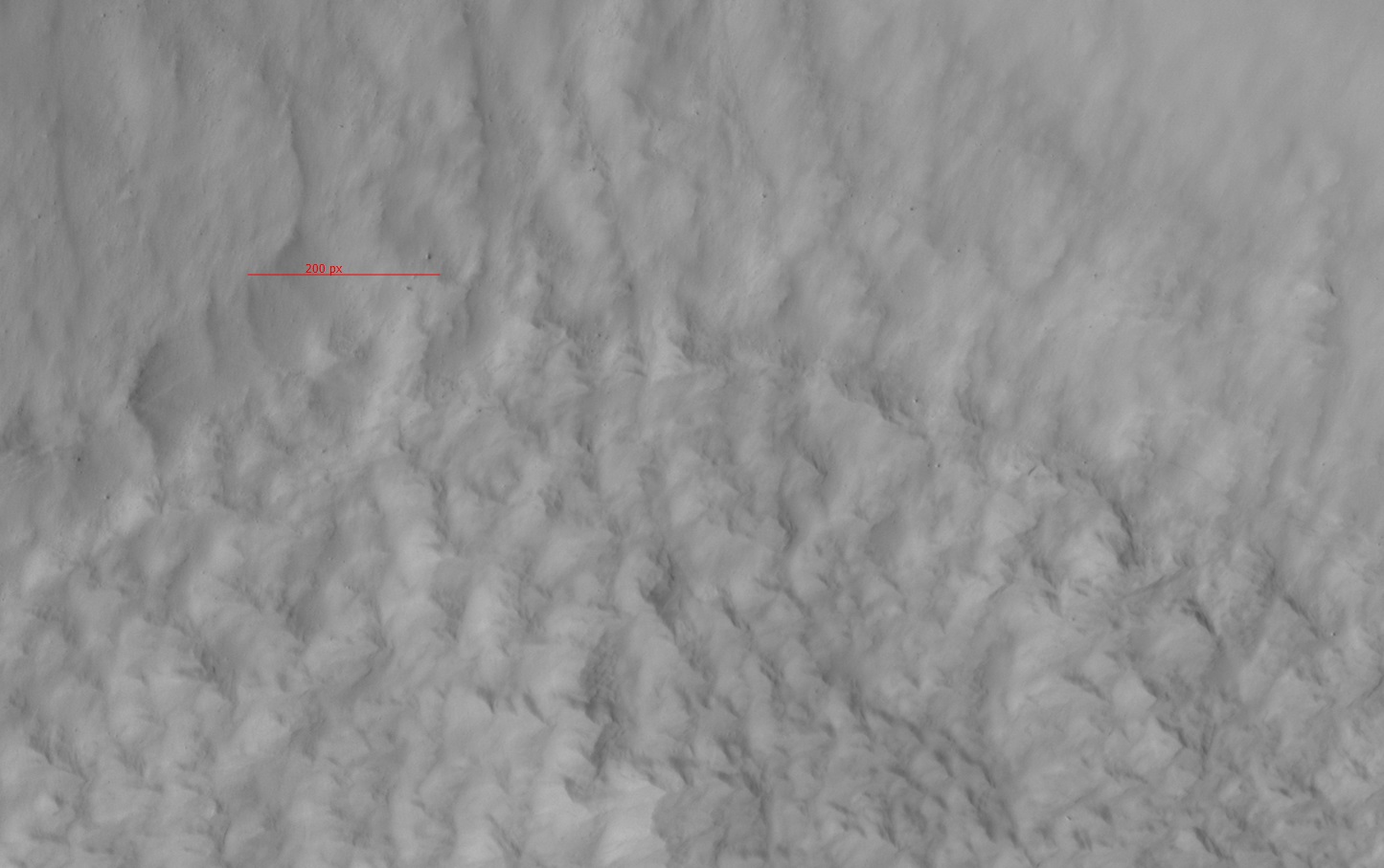 The scale bar is 600 pixels across, or 150 m. This is 15 studs. If we wanted to, we could represent them in great detail. These features are likely created through ground ice wedging. It will be interesting to look at these in the DTM and determine just how much vertical variation they produce.