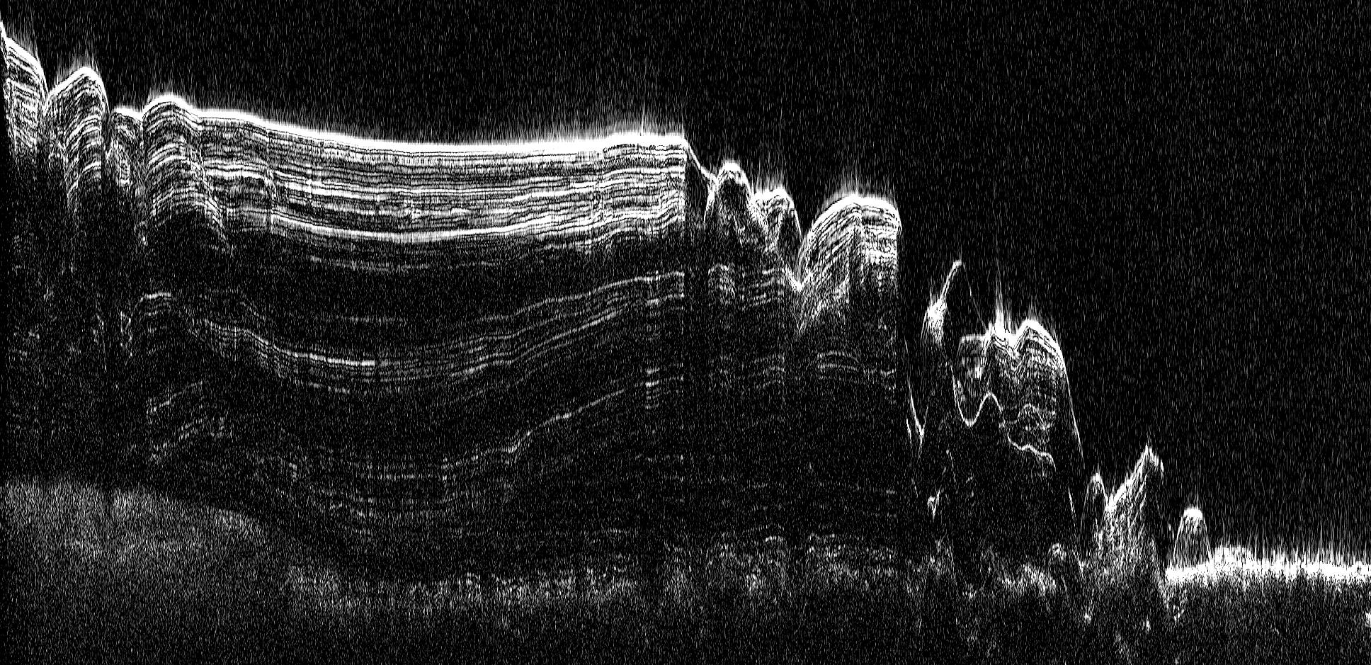 On Mars, the first radar results yielded information on the thicknesses of the ice caps. This was the design goal of the orbital radar systems. Here’s an example of an image creating a cross section of the Martian North Pole taken with the SHARAD instrument (NASA/JPL-Caltech/ASI/UT):