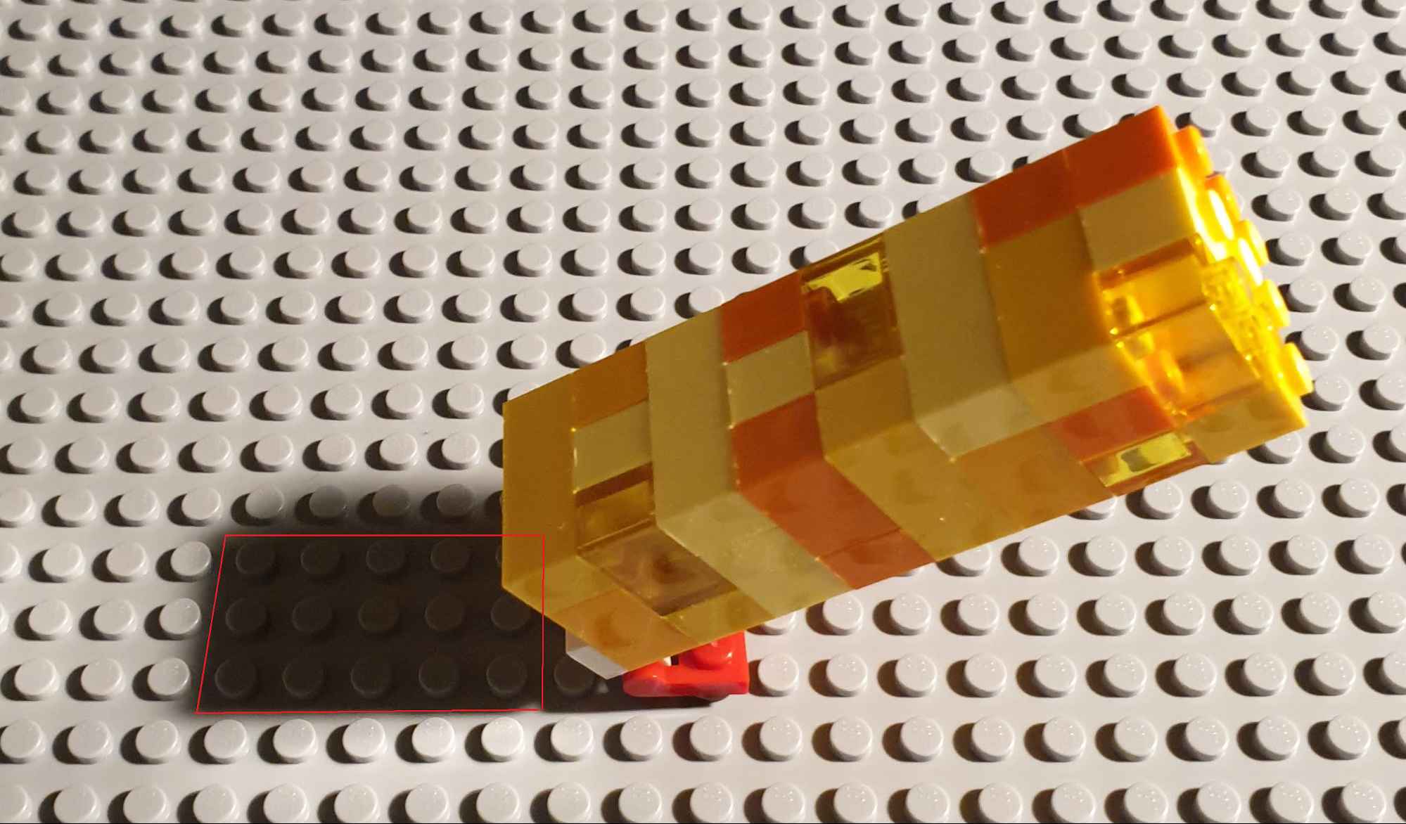 Using our minifigure scale, one square metre is three studs by three studs. Let’s produce a beam of sunlight, for illustration purposes. This beam of sunlight is at least 500 W of power, from which a perfectly aligned solar panel will produce at least 100 W.