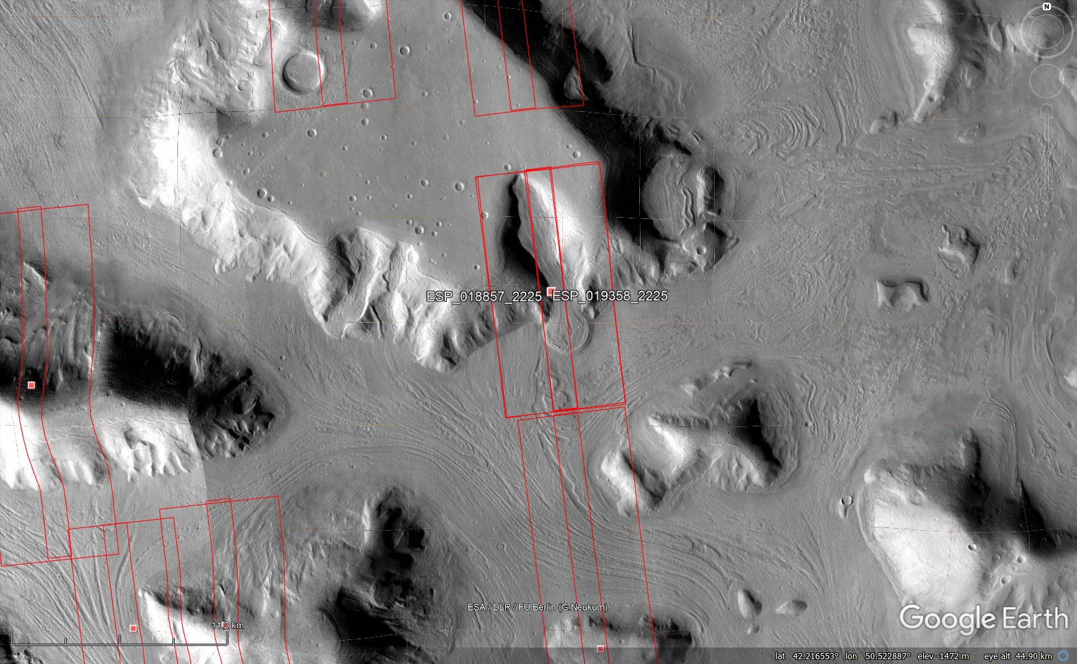 Let’s look at it in a few other datasets, to compare. Here’s the same Google Earth view as above, except with the CTX (wide angle context) imagery.
