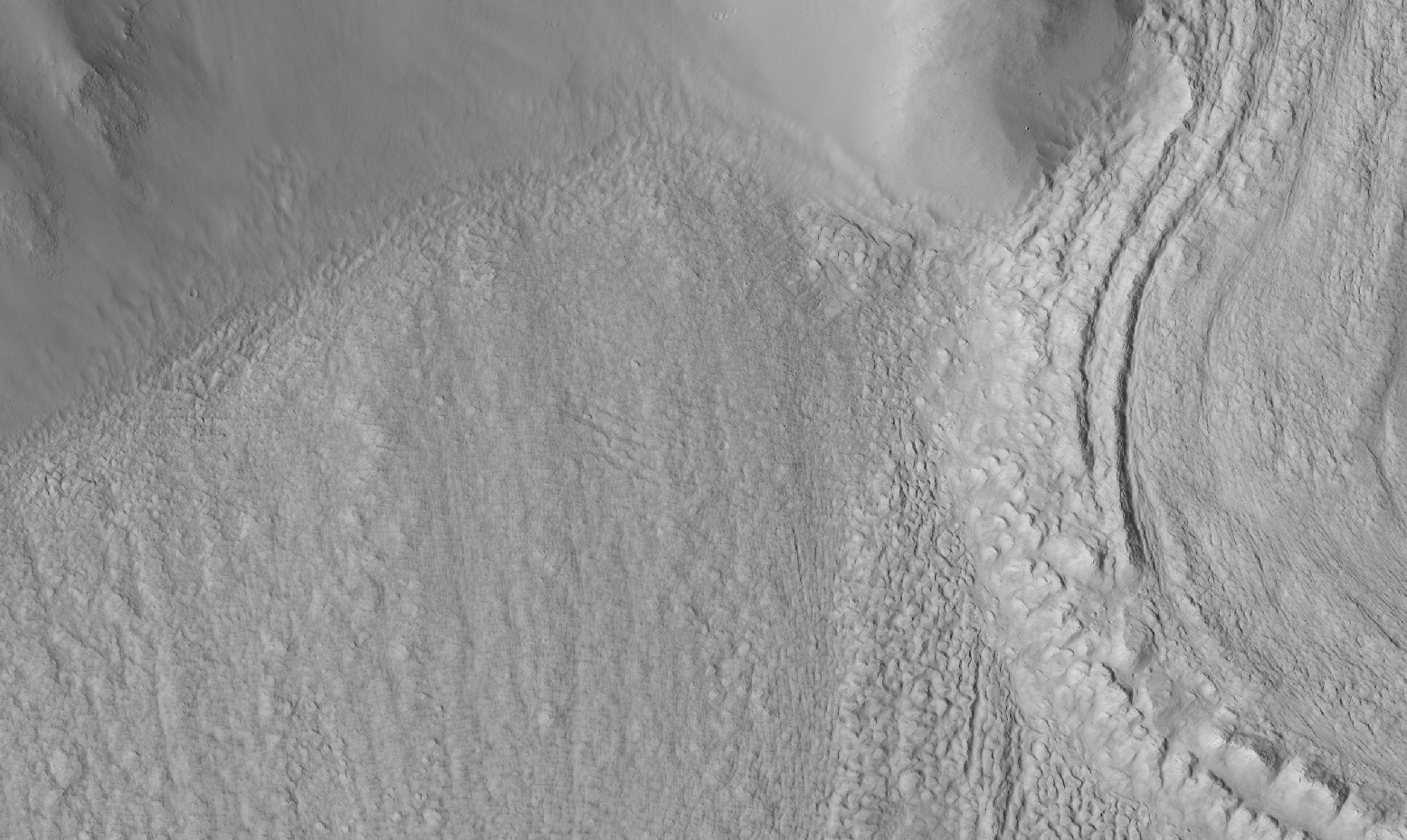 In the bottom right, south of the glacier, you can see something called polygonal terrain, which indicates ice in the soil. The slope coming down from the mountain looks like it’s talus -- debris that’s fallen down the slope -- but there’s some small craters in it indicating it hasn’t moved in a long while (geologically speaking). Let’s zoom into a few spots. First, the ridges on the glacier. Full colour images are available there, so let’s use the colour version.