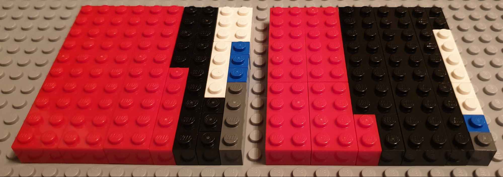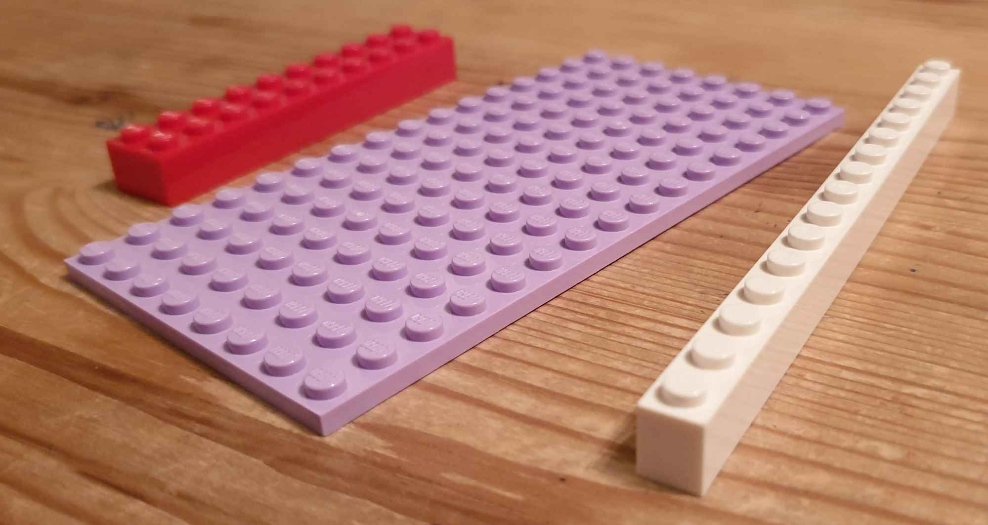 Furthermore, the plate (pink) is one third of a brick, nominally. It is 3.2 mm actual, with less play than the bricks. This creates an awkward ratio: 5:12 - five studs is twelve plates.