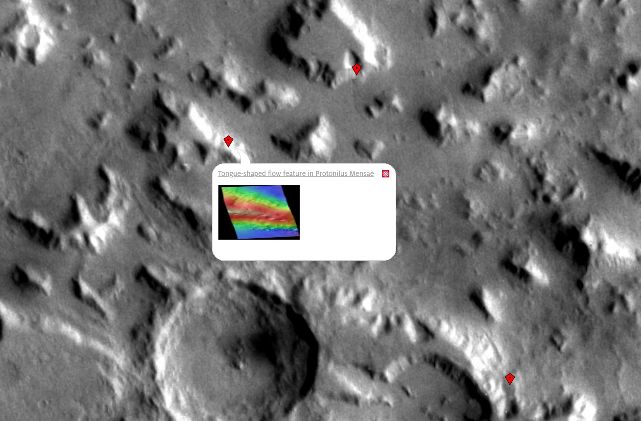 If we overlay the HiRISE bounding boxes, we can see that this was an imaging target of some scientist at some point, and that the two overlapping HiRISE images were taken together to produce the DTM. “Possible Glacier on Mesa Wall in Protonilus Mensae”. There’s also a bunch of HiRISE imaging nearby, but they are only single images, not pairs, so no DTMs are available.